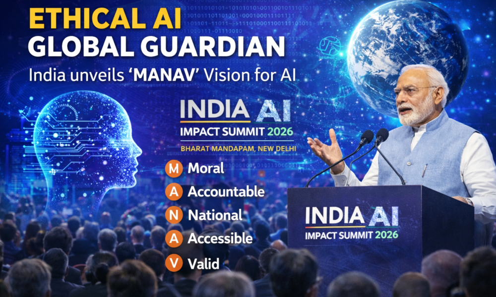 नई दिल्ली – ‘इंडिया एआई इम्पैक्ट समिट 2026‘ में एक ऐतिहासिक संबोधन के दौरान, प्रधानमंत्री नरेन्द्र मोदी ने भारत को नैतिक आर्टिफिशियल इंटेलिजेंस के वैश्विक संरक्षक के रूप में स्थापित किया। भारत मंडपम में राष्ट्राध्यक्षों, तकनीकी दिग्गजों और नवाचारियों की एक विशाल सभा को संबोधित करते हुए, प्रधानमंत्री ने इस बात पर जोर दिया कि भारत के लिए एआई “भय” का स्रोत नहीं, बल्कि “भाग्य” का द्वार है। उन्होंने एआई के वैश्विक विकास के लिए एक व्यापक ‘मानव‘ (MANAV) विजन का अनावरण किया, जो यह सुनिश्चित करेगा कि यह तकनीक विनाश के बजाय सशक्तिकरण का साधन बनी रहे।