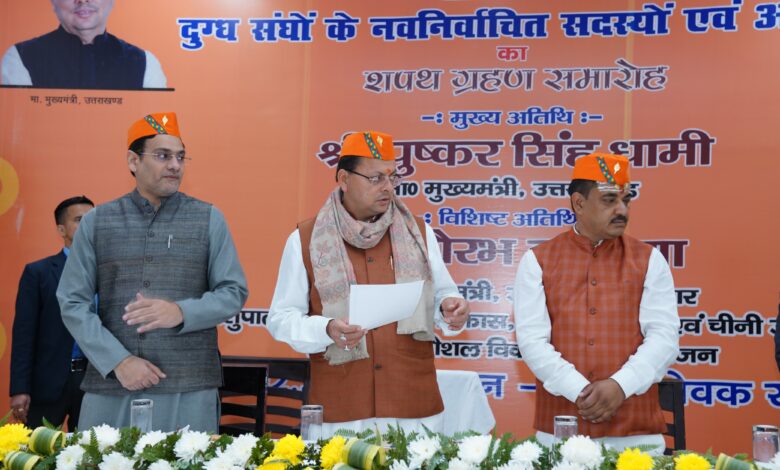 देहरादून। मुख्यमंत्री पुष्कर सिंह धामी द्वारा रविवार को मुख्यमंत्री आवास स्थित मुख्य सेवक सदन में 7 जनपदों अल्मोडा, चम्पावत, पिथौरागढ, ऊधमसिंह नगर, देहरादून, चमोली एवं पौड़ी के दुग्ध उत्पादन समिति के नवनियुक्त पदाधिकारियों को शपथ दिलाई। उन्होंने सभी को शुभकामनाएं देते हुए उम्मीद जताई कि सभी पदाधिकारी मिलकर उत्तराखंड में न सिर्फ दुग्ध उत्पादन को बढ़ाने की दिशा में काम करेंगे बल्कि हमारे प्रदेश के गांवों में रहने वाले किसानों और दुग्ध उत्पादकों की समृद्धि भी सुनिश्चित करेंगे। इस अवसर पर पशुपालन एवं दुग्ध विकास मंत्री श्री सौरभ बहुगुणा भी मौजूद थे।