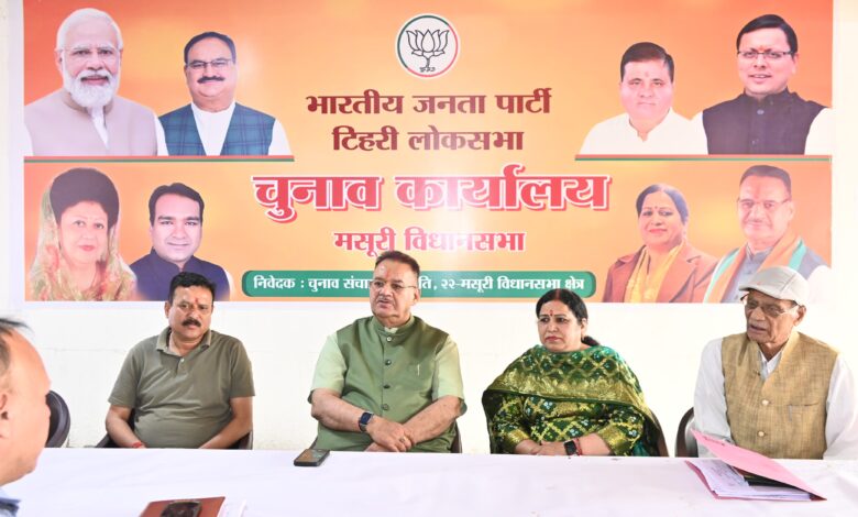 देहरादून। देहरादून के सालावाला स्थित टिहरी लोकसभा के मसूरी विधानसभा चुनाव कार्यालय में कैबिनेट मंत्री गणेश जोशी की अध्यक्षता में बैठक आयोजित की गई। बैठक में 11 अप्रैल को ऋषिकेश में आयोजित प्रधानमंत्री नरेन्द्र मोदी की विशाल जनसभा को सफल बनाने की दृष्टि से कैबिनेट मंत्री गणेश जोशी ने कार्यकर्ताओं से सभी तैयारियां समय पर पूर्ण करने तथा अधिक से अधिक संख्या में लोगों की भागीदारी जनसभा में सुनिश्चित करने का आव्हान किया। प्रधानमंत्री नरेंद्र मोदी के द्वारा गढ़वाल मंडल के तीनों लोकसभा क्षेत्रों टिहरी, पौड़ी और हरिद्वार की एक साथ जनसभा को संबोधित किया जाएगा। इस जनसभा के साक्षी लाखों लोग बनेंगे। संख्या की दृष्टि से मसूरी विधानसभा से आठ हजार से अधिक लोग रैली में जाएँगे। इस अवसर पर विधानसभा चुनाव प्रभारी कमली भट्ट, महानगर महामंत्री सुरेन्द्र राणा, पूर्व मंडल अध्यक्ष पूनम नौटियाल, आरएस परिहार, अंकित जोशी सहित पार्टी कार्यकर्ता उपस्थित रहे।